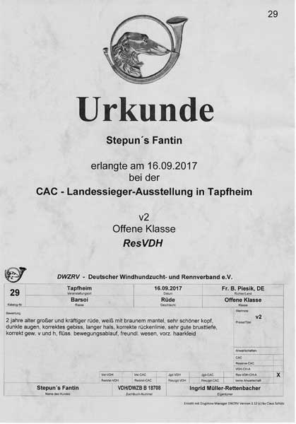 Stepun's Fantin startet in der offenen Klasse und bekommt V2 ResVDH und diesen wunderschönen Richterbericht.